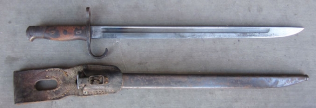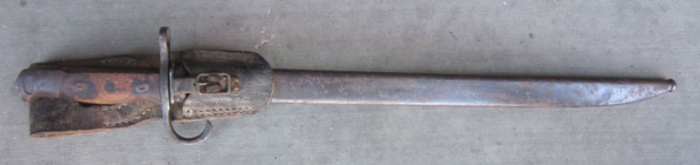 Item #68739 : Original period manufacture. Hooked guard, contoured wooden grips, rounded bird head pommel, bright finished blade. Original brown leather frog, the tip of the securing strap is missing. Blue finish scabbard showing scattered denting and spots of surface corrosion. Sound original bayonet in typical WWII souvenir condition.
