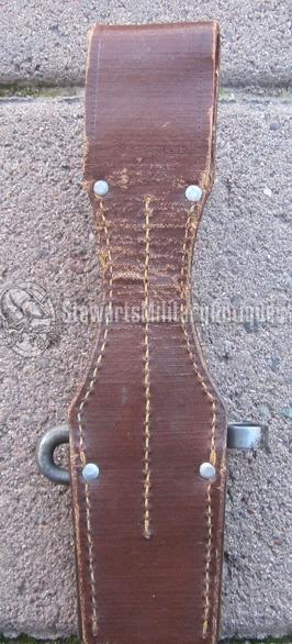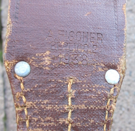 Item #69053 : Original period manufacture. A very interesting bayonet we purchased out of an old collection about 20 years ago, sold locally to another collector about 15 years ago, and repurchased from that gentlemen last November. Standard model Austrian M1895 pattern NCO bayonet which once had the loop on the pommel for a knot. Feldgrau painted steel scabbard with the Austrian Imperial eagle stamped onto the frog stud, and again on the obverse ricasso, and on the reverse the letters CE over WG. Of course what is special about the bayonet is the aluminum Edelweiss flower nailed to the obverse grip plate. The frog is of interest too, as the main portion is made from a brown rubberized fabric, dated on the reverse 1938 and made by A.FISCHER of Berlin. The front part of the frog with the stud opening is of brown leather. Great bayonet.
