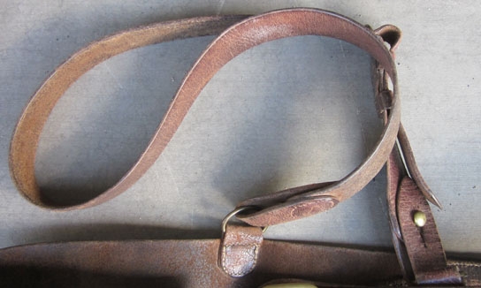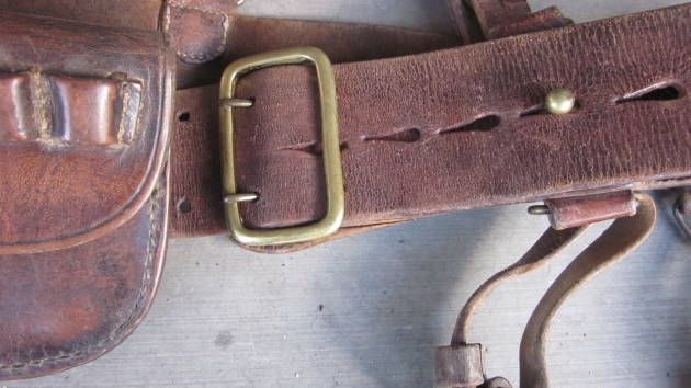 Original period manufacture. Brown leather adjustable belt with a double prong brass frame buckle, all other metal fittings are also brass. On the belt at the time of our puchase were the shoulder strap, pistol ammunition pouch with exposed loops and leather sword hanger. The leather remains pliable, no dry rot, no visible markings.