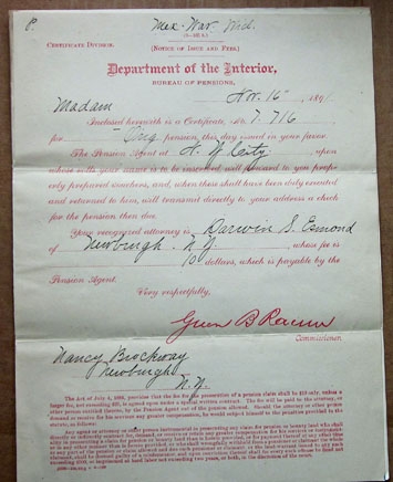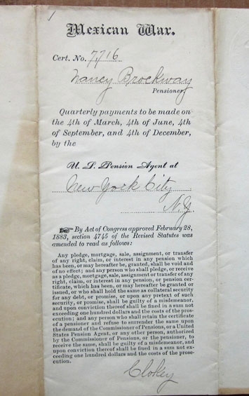 Item #68600 : Original period manufacture. Two period documents pertaining to the Widow's Pension of Nancy Brockway, whose husband Isaac served on the USS Independence during the Mexican War. She was entitled to the sum of 8 dollars per month, per the date of November 16th, 1891. Should be a fun research project, the documents are sound, very readable and measure about 8.5 x 11 inches.