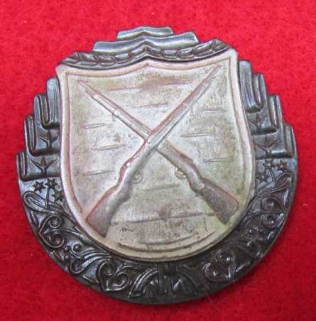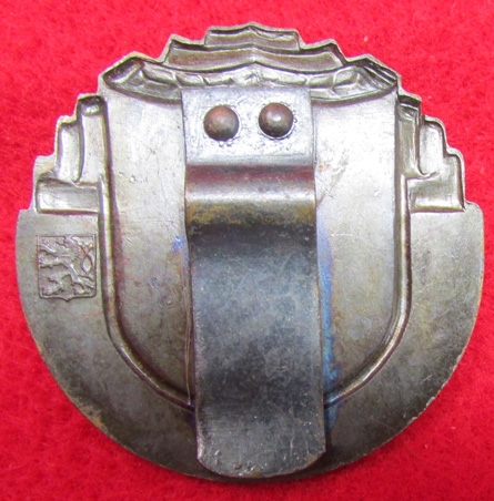 Original era manufacture. A well made pocket badge of darkened bronze with a silver shield at center. Czech Lion proof mark on the reverse.