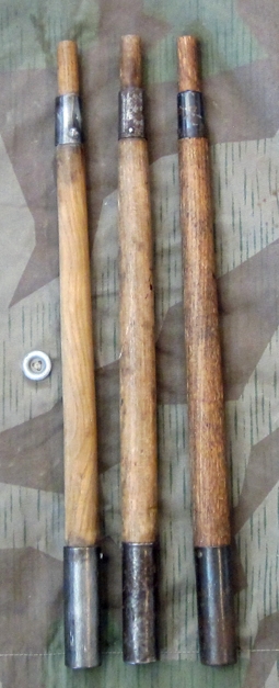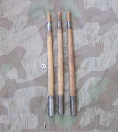 Item #69338 : Original period manufacture. A solid example with good color, all buttons present, grommets are intact, with very minor staining and no major holes or tears. The fabric shows honest wear and use, with small pinholes or very minor tearing visible in the fabric. Also included, are three German tentpoles which would have been the basic issue for a Landser during WWII. These can be assembled by inserting the tapered end into the bottom of the other poles and voila you have a home for the night.