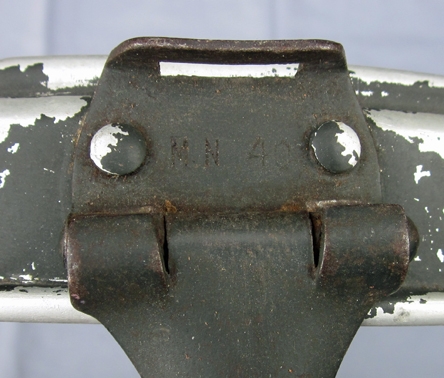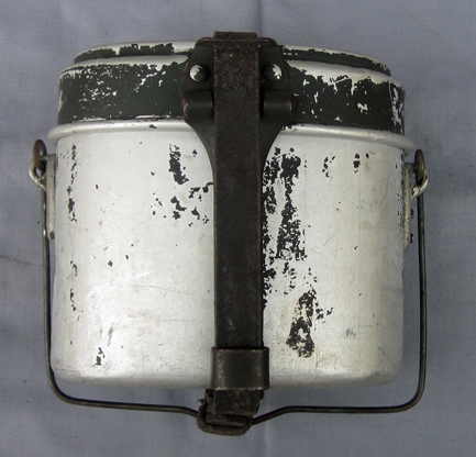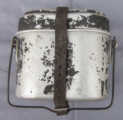 Item #69311 : Original period manufacture. Aluminum cookpot with a steel folding handle and wire bale. Maker marked on the handle hinge MN 40. Traces of dark feldgrau paint remains. Original leather equipment strap was affixed to the pot at the time of our purchase.
