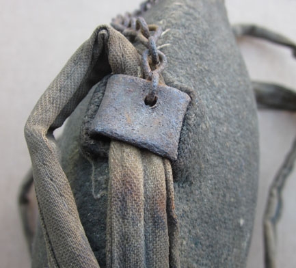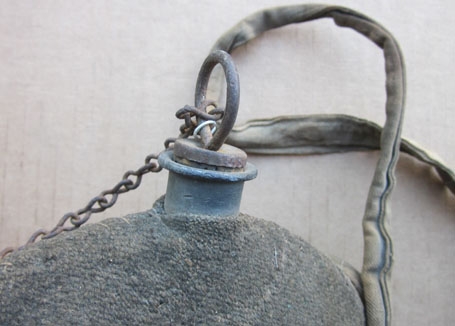 Item #68590 : Original period manufacture. Smooth faced body, issue canteen as used in the American Civil War. Complete with it's original cloth shoulder strap, cork stopper and attaching chain. The wool covering is a dark brownish gray, showing soiling and age. The body has some shallow dents but sound.