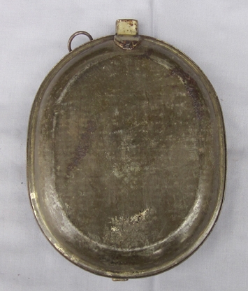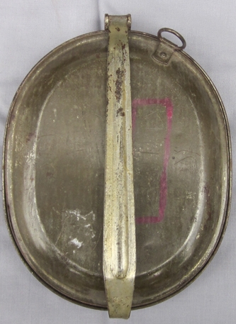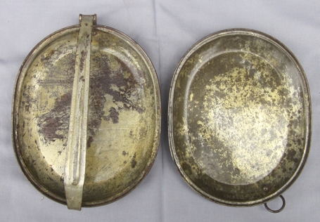 Item #69315 : Original period manufacture. Stamped steel messkit or meatcan with a tinned finish, now with a collector added varnish covering. Grand Daddy of the US messkit used up through the Vietnam War.