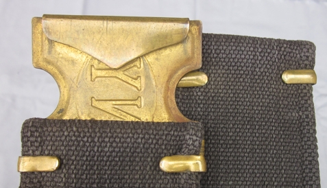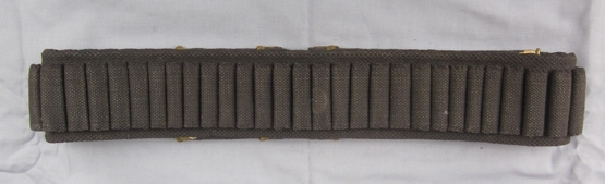 Item #69319 : Original period manufacture. A sound blue woven canvas cartridge belt with loops for 45 30-40 cartridges.Original stamped brass H-pattern NY buckle marked MILLS on the catch. Bright and shiny brass fittings throughout, minor wear to the exterior, no damage, light wear and use.