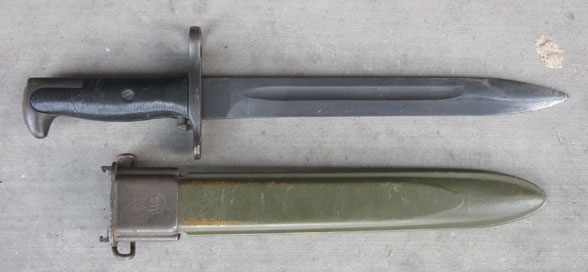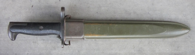 Item #68717 : Original period manufacture. Parkerized finish, manufactured 10 inch blade with most of the original finish remaining on the blade, guard and pommel. Operable lock button, nice black plastic grips. Original GI green plastic scabbard with an unpainted steel throat.