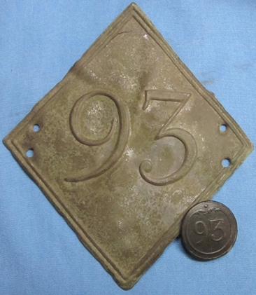 Original period manufacture. Field recovered, stamped brass diamond shaped plate measuring 95 x 115 mm across the points, hand struck mounting holes. 93rd Regiment of the Line. Raised in 1706, their colonel was killed at Moscow in 1812, another was killed at Waterloo. Comes with several pages of printed research on the history of the 93rd.