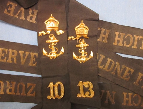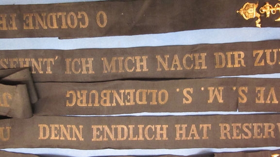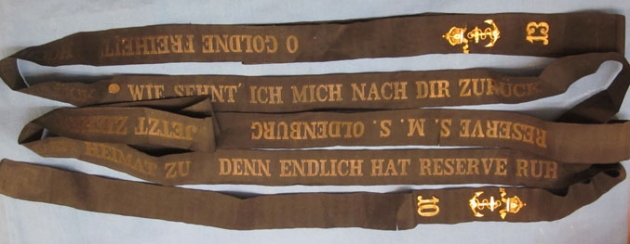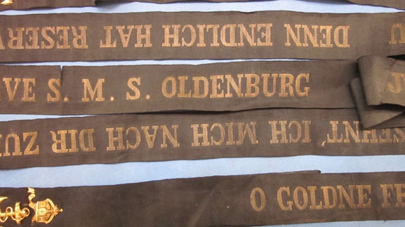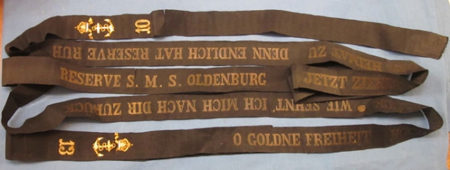 Original period manufacture. Oversize cap tally measuring nearly 14 feet in length. Embroidered in gold color thread are numerous patriotic and congratulatory slogans along with a ships name SMS Oldenburg. Metal Imperial crown, ribbons and anchors, in addition to the numbers 10 and 13, those being the years of his service I believe, 1910-1913. For the most part the ribbon is intact, with two spots were the fabric has almost separated. SMS Oldenburg was a Helgoland Class Dreadnought, joining the fleet in May 1912. She served throughout WWI including the Battle of Jutland. Surrendered to Japan in late 1918, she was sold for scrap in 1920.