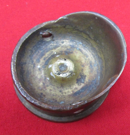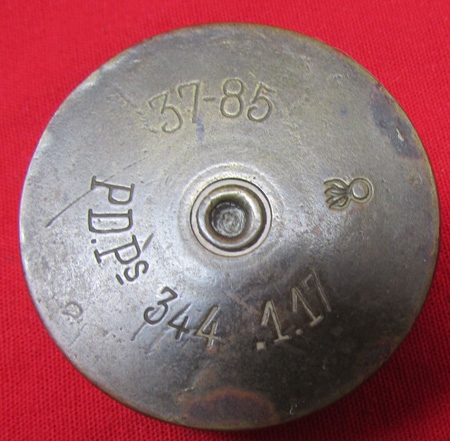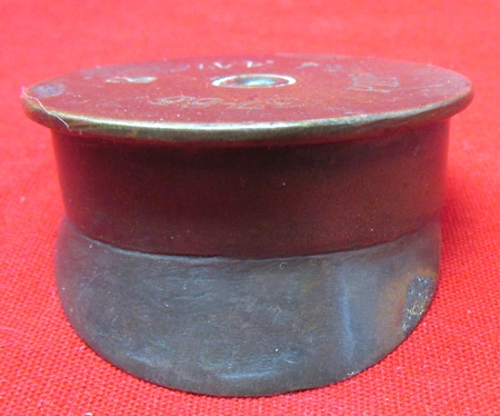 Original era manufacture. Neat little visor hat, made from the base of a WWI German .37 mm projectile casing. Dated 1917 on the bottom, the hat once had a chinstrap, which is now missing. Brass patina finish.