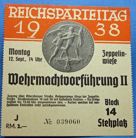German WWII 1938 Reichsparteitag Ticket Stub, Monday 12 September 1938