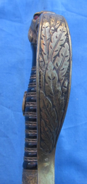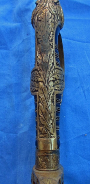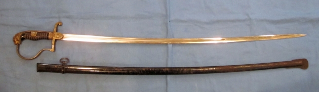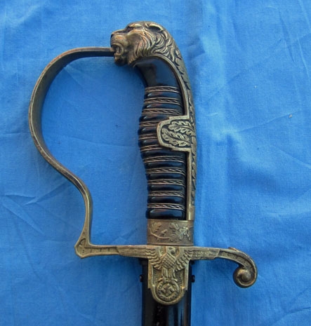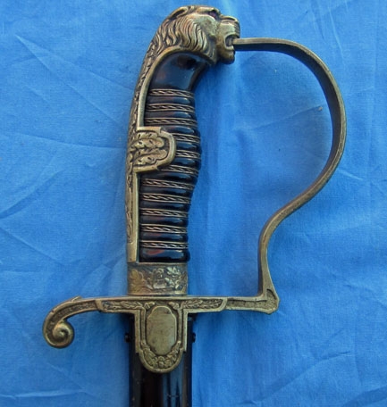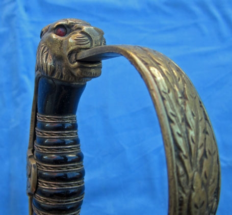 Original period manufacture. Polished steel blade measuring 31.5 inches in length, runs straight and true. Ornate brass guard with a lion head pommel and two red glass eyes. The blade is clean, no issues, no visible makers mark. Black plastic grip bound with triple strand wire. Dent free black painted scabbard with both throat screws present. About 60% original finish, the remainder is a mix of surface corrosion and steel patina.
