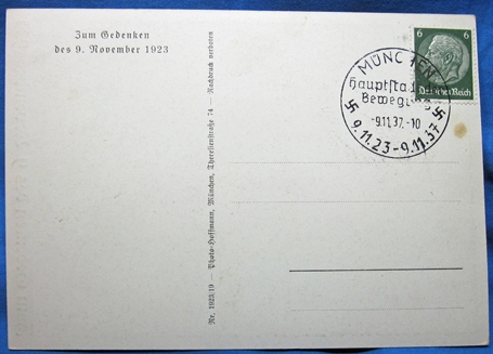 Original period manufacture. Multi color postcard issued for the 14th anniversary of the 1923 Beer Hall Putsch. Munich cancellation on the reverse.