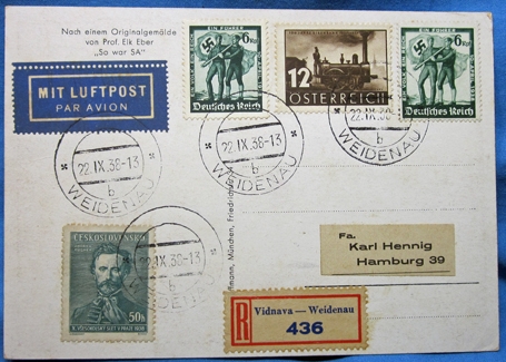 Original period manufacture. Full color postcard, numerous stamps and 1938 cancellation on the reverse.