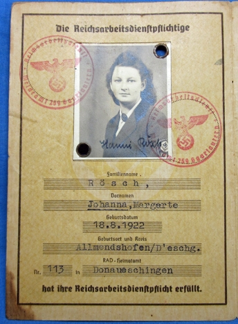 Original period manufacture. RAD identity card of a young woman born in 1922. She joined the Arbeitsdienst in 1940. Numerous entries, nice clear photo.