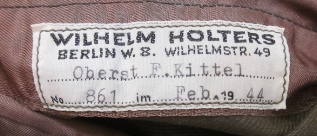 Original period manufacture. Four pocket, summer weight, feldgrau gaberdine wool service coat, once worn by Generalmajor Friedrich Kittel (1896-1973), who was awarded the Ritterkreuz in January 1945. Pleated pockets with pointed flaps, gilt pebbled buttons throughout. Machine sewn general officer pattern collar tabs, hand sewn gold wire coat eagle, original sewn general officer shoulder boards in the rank of Generalmajor, a rank he was promoted to on December 23rd 1944. The inner pocket lining displays the tailor tag from the prestigious firm of Wilhelm Holters of Berlin. It bears the date of February 1944, and identifies the owner as Oberst F.Kittel. Friedrick Kittel joined the German Army in June of 1915, serving to the end of WWI. During his wartime he was severely wounded on 29 August 1918, however he remained in the army postwar. During WWII he commanded the 468th Infantry Rgt 1940-42, later he served in an assortment of staff commands until late 1944 when he was promoted to Generalmajor and given the command of the 62nd Volksgrenadier Division, which he commanded until February 1945. He entered captivity in May of 1945 and was released in June 1947. The coat is in very sound condition, no moth issues to mention, with all of the insignia and buttons securely attached to the uniform. Full imitation silk body lining, with a striped lining to each sleeve. Size is a snug 40 regular. There are loops above the upper left pocket for a long ribbon bar, and numerous loops on the pocket itself for several awards and badges. There are no loops on the right upper pocket, although records indicate he was awarded the German Cross in Gold in 1942.