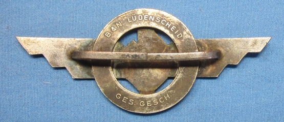 Original period manufacture. Buntmetal winged emblem with a black enameled swastika and red enameled ring. Two mounting pins on the reverse. Maker marked B&N (Berg & Nolte) Ludenscheid. Nice old patina finish. Measures 2.75 inches in width.