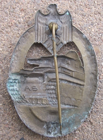 Original period manufacture. Hollow Back Bronze Panzer Assault badge by Adolf Scholze, letters AS on the reverse. Ball type hinge, missing the catch. Uncleaned, salty patina finish.
