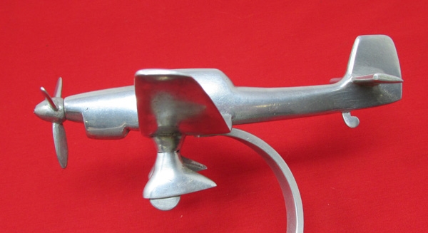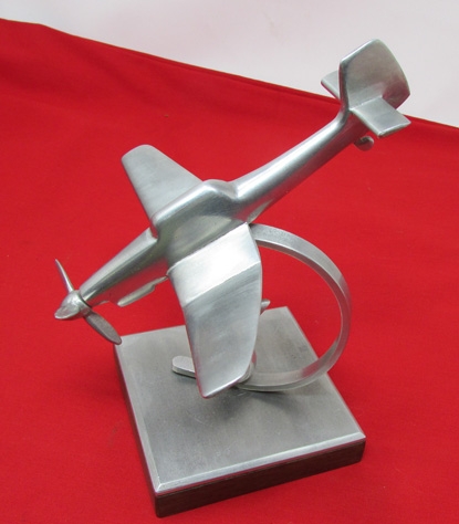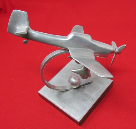 Original era manufacture. A cast aluminum desk model of the famous Luftwaffe dive bomber of WWII.The aircraft is portrayed ina dive position, and is complete with a movable propeller, landing gear and tail wheel.The surface has a very smooth finish, no rough edges from a casting. The aircraft rests on a curved aluminum mount with an aluminum ball finial holding it upright on the base.Square aluminum base with beveled edges, mountedto a block of brownMicarta like material.Dimensionally as follows 170 mm (6.75 inches) wingspan, 165 mm (6 inche)fuselage length, and overall height 190 mm (7.5 inches).Difficult to say with any certainty who made the thing, however the quality of the end result shows a lot of care and thought going in to its construction.Light age and wear, easily dis-assembles for shipping.