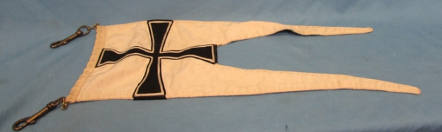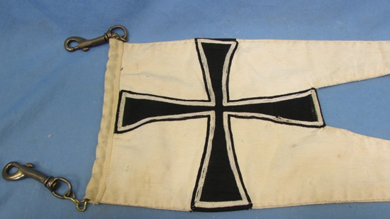 Original era manufacture. Swallow tail, double sided pennant which measures 22 inches in length. There is a linked chain which passes through the white canvas hoist with a snaphook on each end. Black cotton maltese cross on each side with white chainstitched decoration. Normal age and wear no damage.