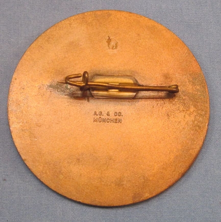 Original period manufacture. Large format bronze gilt badge with an enameled design on the obverse. Pinback reverse displaying the lettering, A.G. & Co. Munchen. Measures 60 mm in width.