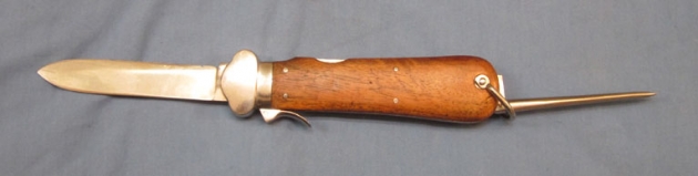 Original period manufacture. A very clean example of the Luftwaffe Gravity Knife, non-takedown model, manufactured by Weyersberg. The locking springs are intact, original wood grips are sound, with no corrosion issues. Lightly sharpened cutting edge, with a shallow nick in the edge at the base. Luftwaffe proof at the base of the marlin spike.