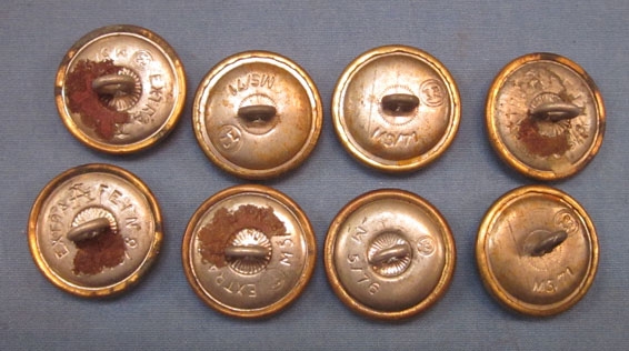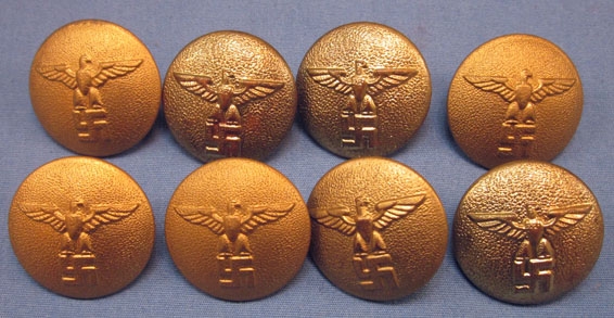 Original period manufacture. Lot of 8 NSDAP tunic buttons, gilt obverse, with period markings on the reverse of each. Average width, 23 mm. Normal age and wear as shown. I believe these are overcoat size buttons, not shoulder strap or cuff.
