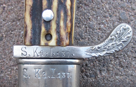 Original period manufacture. A very handsome bayonet, with an operable lock button, matching unit numbers guard to scabbard throat and original stag grips. Very sound black leather bodied scabbard fitted with chrome finished alloy throat and chape. Unit markings, S.Ka.I. 137, Schutzpolizei Kassel, Unit I, Weapon 137. Only detraction is that the police eagle emblem is missing, otherwise a fine example.
