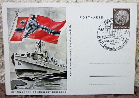 Original period manufacture. German Kriegsmarine E-Boot, full color RKF flag, 1941 Hitler's Birthday cancel, Hannover.