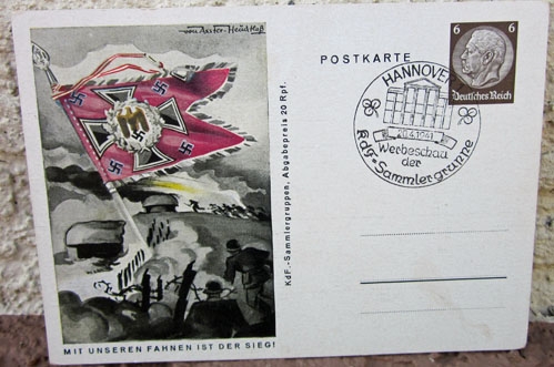 Original period manufacture. Color depiction of a swallowtail flag of the German Army Smoke Troops. Hannover Hitler's Birthday 1941 cancellation.