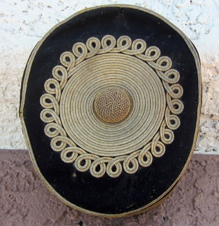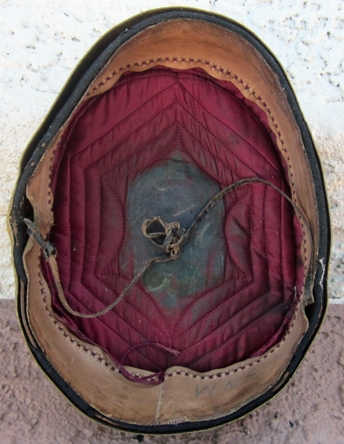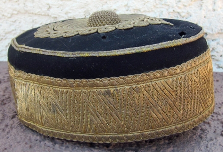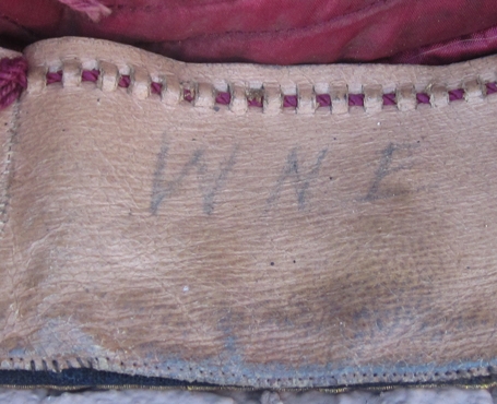 Item #69302 : Original period manufacture. Blue wool pill box cap with a red silk quilted lining, gold wire piping and gold brocade trim. Intact thin leather chin strap, thin brown leather sweatband with the initials W.N.E. written on the surface. Minor mothing.