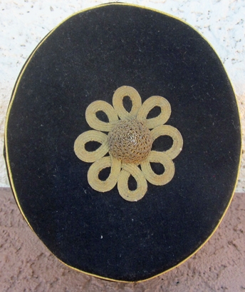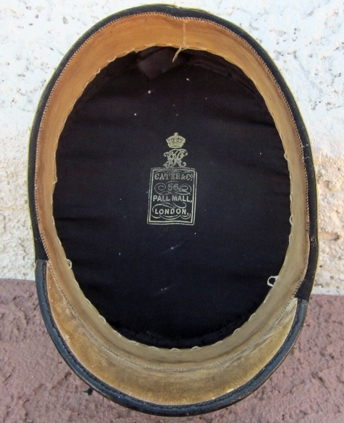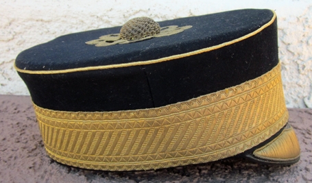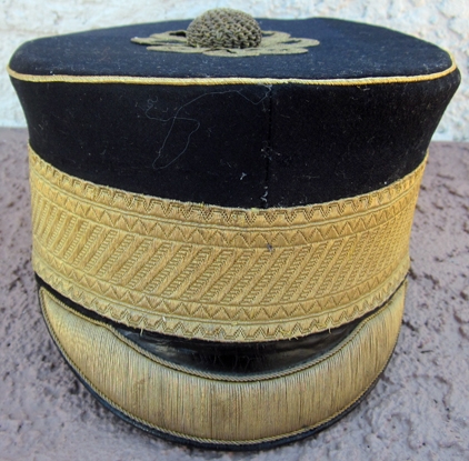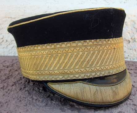 Item #69300 : Original period manufacture. Dark blue wool top with gold wire piping, visor trim and gold brocade cap band. Black silk lining with a gilt Cater & Co. makers label. Tan leather sweatband no moth issues.