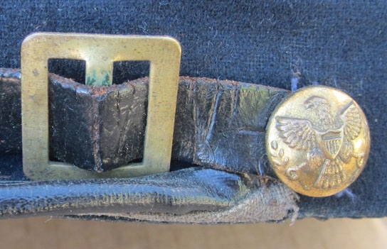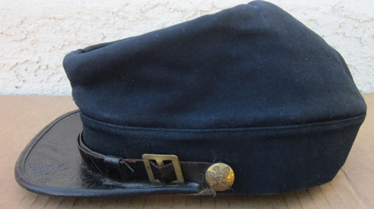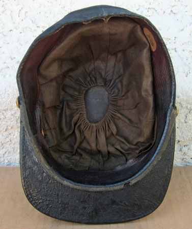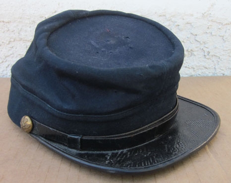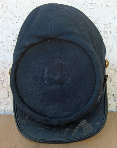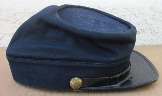 Item #68578 : Original period manufacture. Issue cap with a dark blue wool body, patent leather visor with a bound edge and an adjustable chinstrap. Brown polished cotton liner with a drawstring center, black painted leather disc in the top. Securely sewn brown leather sweatband, faded size tag, and an oval shaped US QMG tag, size about a 6 3/4. Evidence of insignia once being worn on the front and the top of the hat, with some minor scattered mothing, typical for it's age. Brass eagle button on each side holding the chinstrap in place. Last issue Kepi for the US Army.