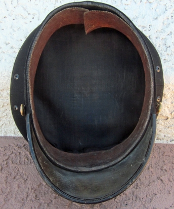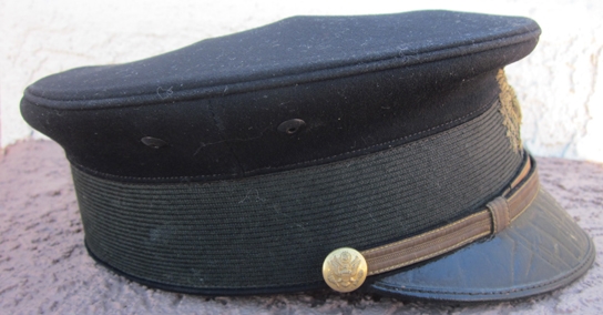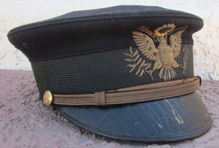 Item #69297 : Original period manufacture. Dark blue wool top with a gold wire, direct embroidered eagle on the front. Black mohair cap band, 1902 pattern eagle buttons with a thin gold brocade, leather backed chinstrap. Black patent leather covered visor with a dark green leatherette underside. Black cotton lining, with a two inch wide brown leather sweatband. Overall the hat "sits" very well, no moth issues to report, only comments would be the top peak is pushed down slightly, the other would be the sweat band at the rear seam is loose on each side. Both are fixable. Scarce hat to find in any condition.