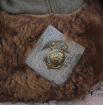 Item #69076 : Original period manufacture. US WWII USMC winter fut cap, as worn by the Marine Expedition to Iceland in 1941. Forest green wool body with fold-down earflaps lined with the same material. Theater made silver color metal diamond on the front with an enlisted EGA collar emblem attached to it. The hat is about a size 7, the only issue being a spot of missing fur at the right rear edge. This is pretty well covered over but the surrounding fur.