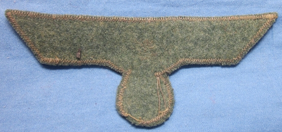 Item #69108 : Original period manufacture. Early pattern Heer enlisted waffenrock eagle, silver wire embroidery on gray backing, feldgrau wool covered reverse. Very clean condition.