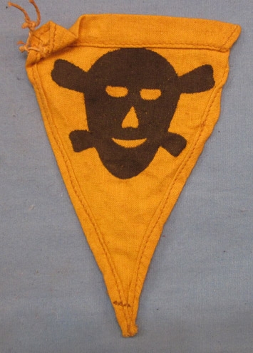 Item #68972 : Original period manufacture. Black stenciled skull and crossbones on a small yellow pennant. Typical age and wear.