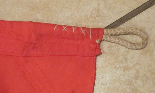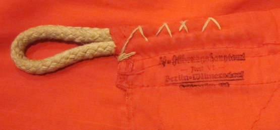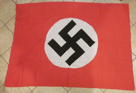 Item #69336 : Original period manufacture. A quality manufacture, double sided flag with a rope halyard loop in two corners. Printed swastika on a white cotton disc, machine sewn to the body of the flag. Shows typical age and staining, no holes or tears.