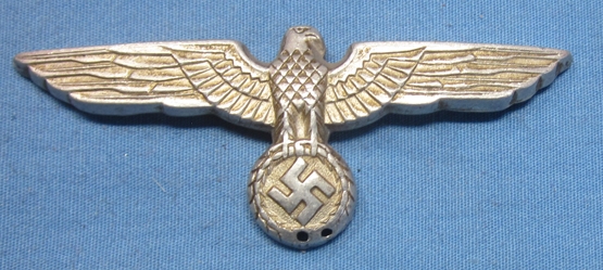 Item #69170 : Original period manufacture. Aluminum cap eagle with two mounting prongs on the reverse. Interesting soldier modification, with two tiny holes drilled into the bottom edge of the wreath. Allowed the wearer to sew down the wreath to the body of the hat.