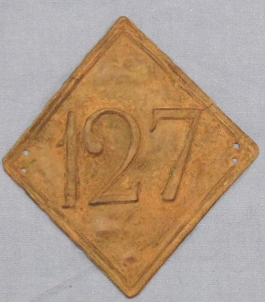Item #68997 : Original period manufacture. Field recovered, stamped brass diamond shaped plate measuring 95 x 115 mm across the points, hand struck mounting holes. This regiment was formed from German soldiers from the Hanseatic Cities of Hamburg and Luebeck, for service in Napoleon's Grande Armee. Their battle honors include Smolensk, Moscow & Berezina River. Comes with two pages of printed research on the history of the 127th.
