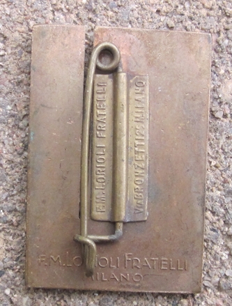 Item #69345 : Original period manufacture. A high quality bronze badge with a pinback reverse. Maker marked Fratelli Milano. 23 x 35 mm.