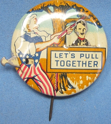 Item #69291 : Original period manufacture.Colorful, 40mm steel lithographed pin, "Let's Pull together". By pushing down on the small bar next to Uncle Sam, you help hoist Der Fuhrer up by his neck. Works fine. Evans Novelty Company, Chicago.