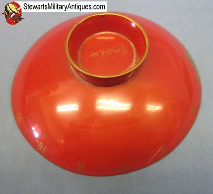 Original era manufacture. Nice quality red lacquered exterior with a handpainted design inside the bowl of the cup. Small crack in the edge near the Rising Sun emblem.