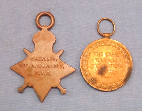 Item #68834 : Original period manufacture. Both medals are named to the same soldier, M2-078938 A. Stevenson, A.S.C..No ribbons. Staining from age and wear. Perhaps someone has his British War Medal for a reunite.