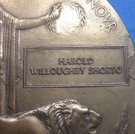 Item #69277 : Original period manufacture. Large brass plaque often referred to by collectors as the Death Penny. This one is named to Harold Willoughby Shorto, who served in the Dorsetshire Regiment in Egypt, being killed in action in November 1917.