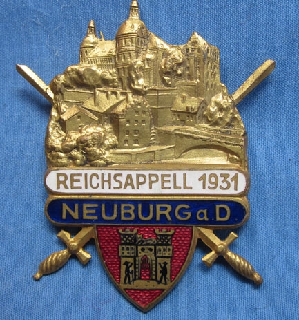 Item #68865 : Original period manufacture. A fine quality, large size badge produced by the firm of C.Poellath, Schrobenhausen. Gilded brass badge with an enameled obverse and pinback reverse. Measures 45 x 62 mm. Prior to the Nazi takeover in 1933, many Nazi approved gatherings took place throughout Germany. This event occurred in Neuburg an der Donau in 1931.