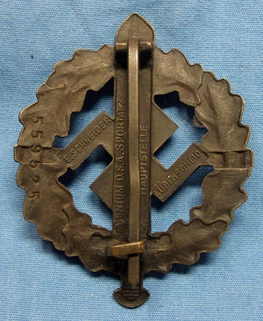 German WWII SA Sports Badge, Bronze, Numbered 559525, E.Schneider Mfg.