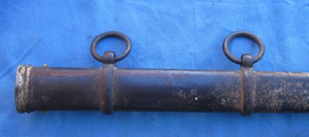 Item #68730 : Original period manufacture. Standard model sword with two carrying rings on the scabbard. Chrome finished blade measuring 33 inches in length, WKC logo on the ricasso, numerous nicks in the blade along it's length. Scattered spots of lifting of the chrome finish, overall the blade remains bright. Darkened brass patina finish to the non-folding guard and pommel cap, shagreen wrapped grip bound with triple strand wire, Wilhelm II cypher on the grip. Steel scabbard, fairly dent free with a plated finish. Mix of steel patina and plating to the surface, both throat screws remain intact. Overall the sword needs a bath, but is otherwise complete and sound.