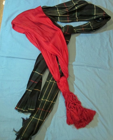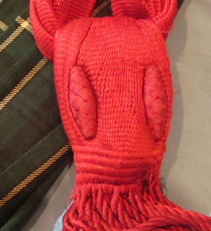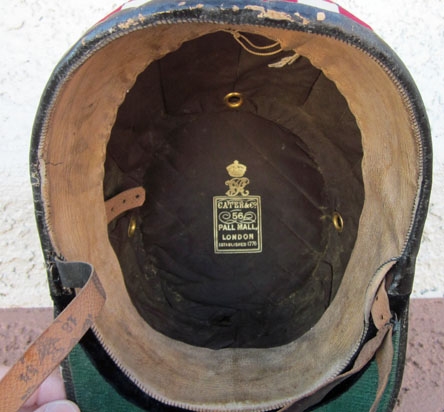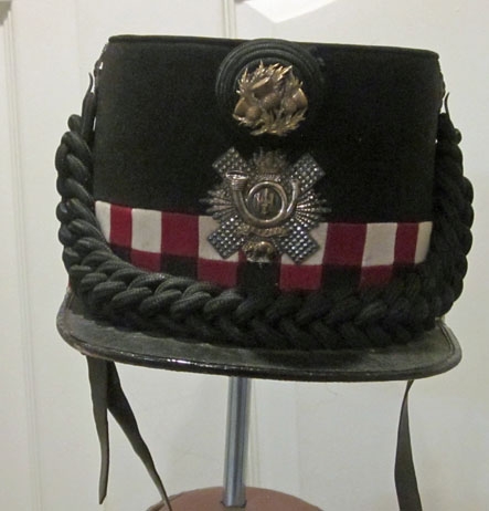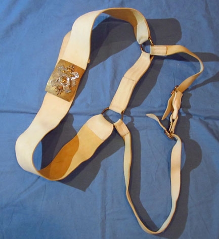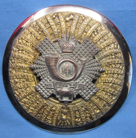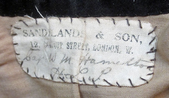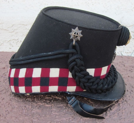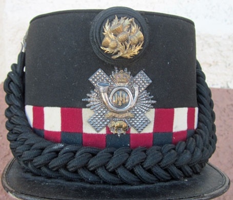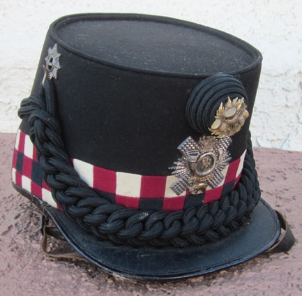 Item #68856 : Original period manufacture. A fine quality, multi-piece set identified to Major William Malcolm Fleming-Hamilton, 1869-1931, who served with the Highland Light Infantry, during the Boer War, and four years of WWI. All of the items were purchased as a lot in the same Edinburgh Scotland auction a few months ago. The lot includes the following, officers quality dress shako & cords, with a printed London tailor shop label in the black silk crown. Officers scarlet wool highland doublet, in the rank of Major, with a London tailors label in the collar, showing the then Captain W.M. Hamilton H.L.I. name, tartan "trews" also with a label in the waistband, faded from wear, but the name Hamilton can still be seen. White buff leather officers sword baldric with elaborate HLI officers quality shoulder belt plate, gold brocade dress belt with HLI officers quality plate, tartan shoulder cloak with a circular HLI brooch, red silk officers sash, with 37 photos provided here to tell the tale. The quality is excellent, no mothing to be seen to the shako, doublet or trews, some minor wear on the backside of the red silk sash, leather instep straps on the cuffs of the trews. The shako is missing it's pompom, the buckle has been altered by the previous collector for display, and the trews have some soiling to the fabric, not stained, just in need of a cleaning, overall a bright, clean set, which looks magnificent on a manniquin. Born in 1869, he served during the Boer War during the final years of Queen Victoria's reign, earning the clasps for Modder River, Paardeberg, Wittebergen and possibly one other for his Queen's SA medal.