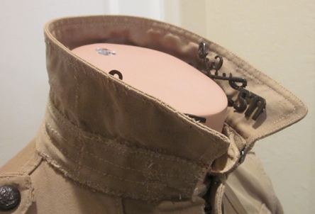 Item #69005 : Original period manufacture. Khaki tan cotton four pocket service coat with a stand and fall collar. The four pockets have side gussets to allow for better use for the soldier. Full set of darkened bronze rimless eagle buttons throughout, each secured with a metal removable clip. Pointed cuff trim on each sleeve end. Collector added but period correct darkened brass collar emblems, US and crossed sabers with 7 over c for C Troop, 7th Cavalry regiment. On each sleeve is a rank chevron for a Cavalry Color Corporal, again, likely collector added but correct to the period. Size about a 36.
